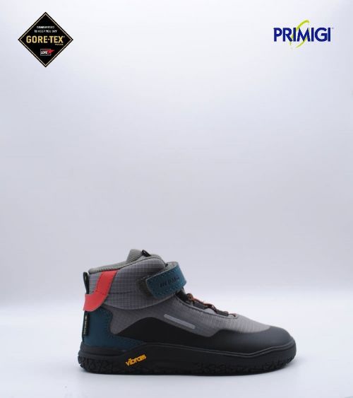 Botín barefoot de la marca italiana Primigi confeccionadas con tecnología GORE TEX en color gris con azul y rojo y suela con tecnología Vibram. Un...