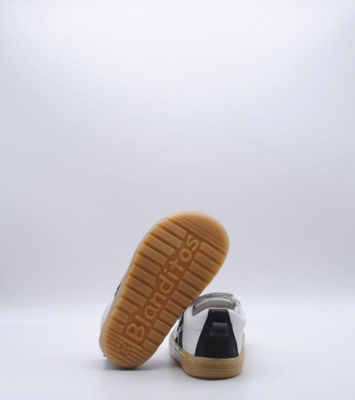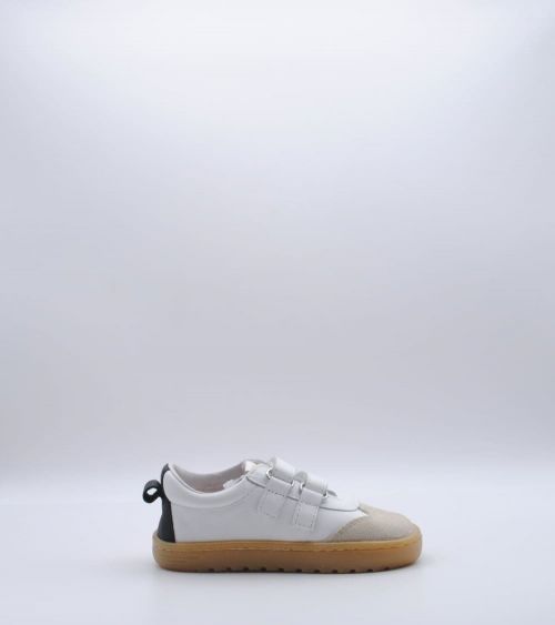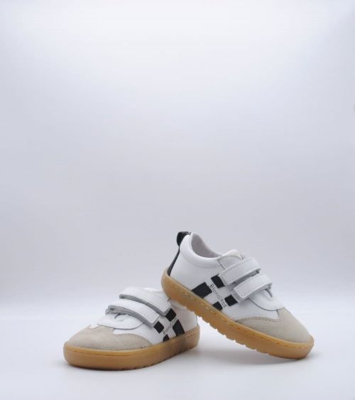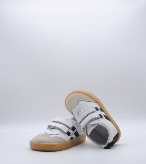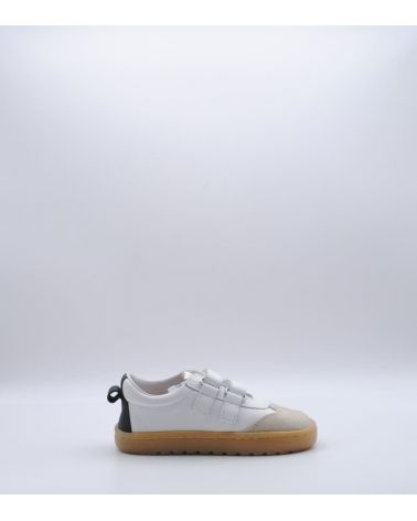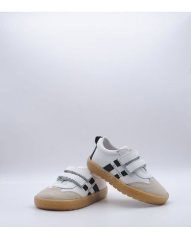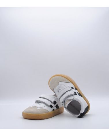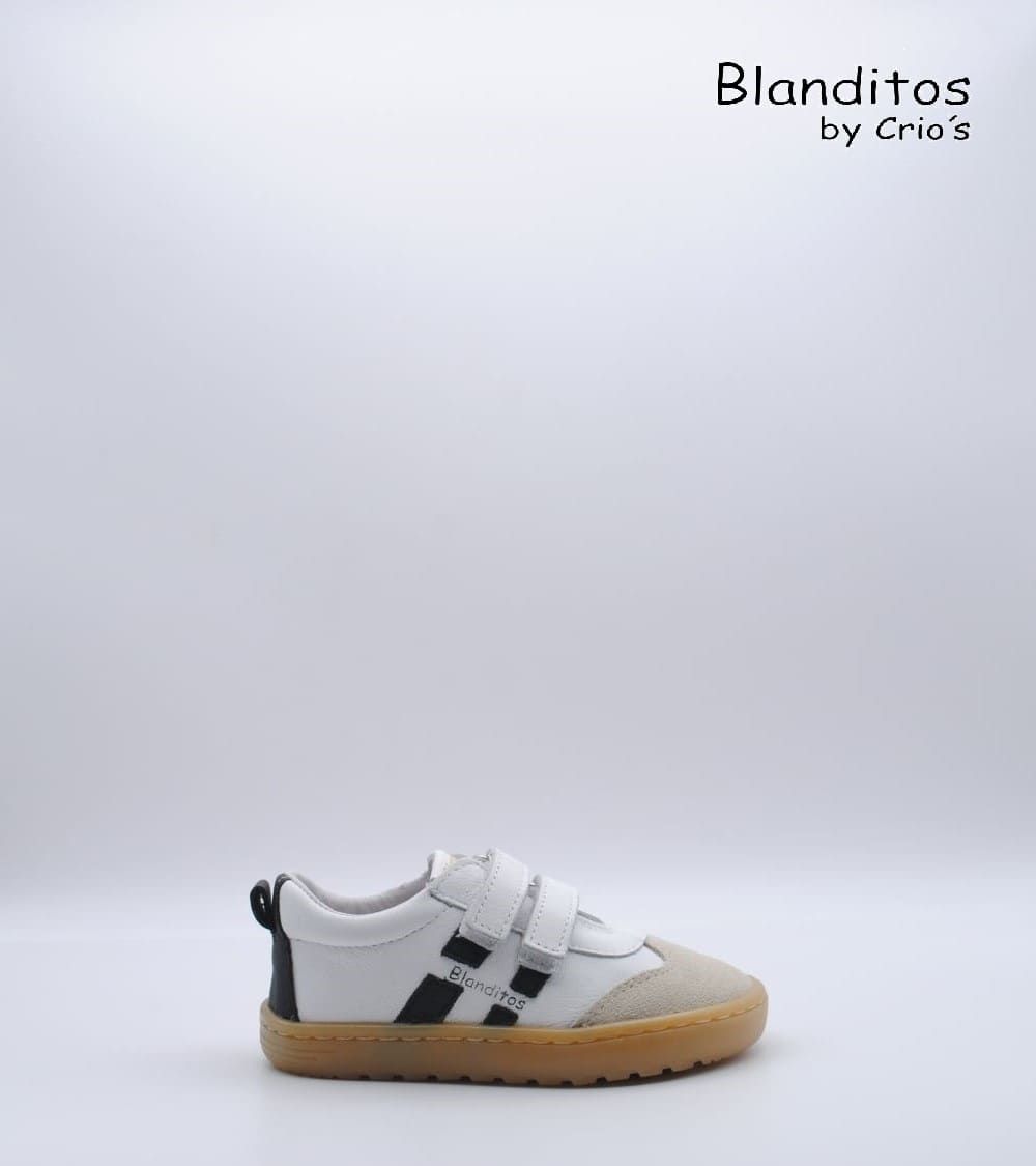 Deportivos respetuosos Blanditos by Crio's modelo Lisboa fabricado en piel color blanco con rayas laterales en negro, con cierre de doble velcro, suela flexible por metatarsianos, 0 drop y sin contrafuerte. ¡Los deportivos respetuosos para usar a diario para disfrutar todo el invierno!