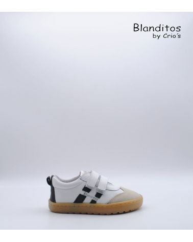 Deportivos respetuosos de la marca Blanditos by Crio's modelo Lisboa fabricados en piel color blanco con detalles de rayas laterales en color negro. Sistema de regulación con doble velcro. ¡Unos deportivos que aportan comodidad para el invierno!