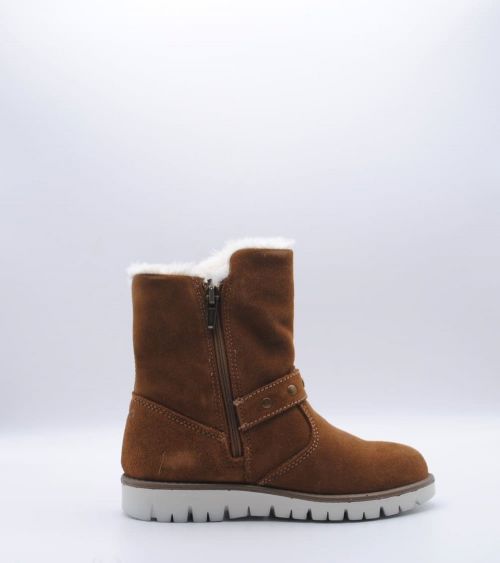 Botas de niña PRIMIGI con membrana GORETEX en piel ante color camel con cierre lateral en la parte interior con cremallera para que sea mas fácil el poner y quitar. Para llevar el pie más calentito estas botas dispones de un forro interior en pelo color blanco a conjunto. La suela de goma es antideslizante, perfecto para los días más lluviosos.