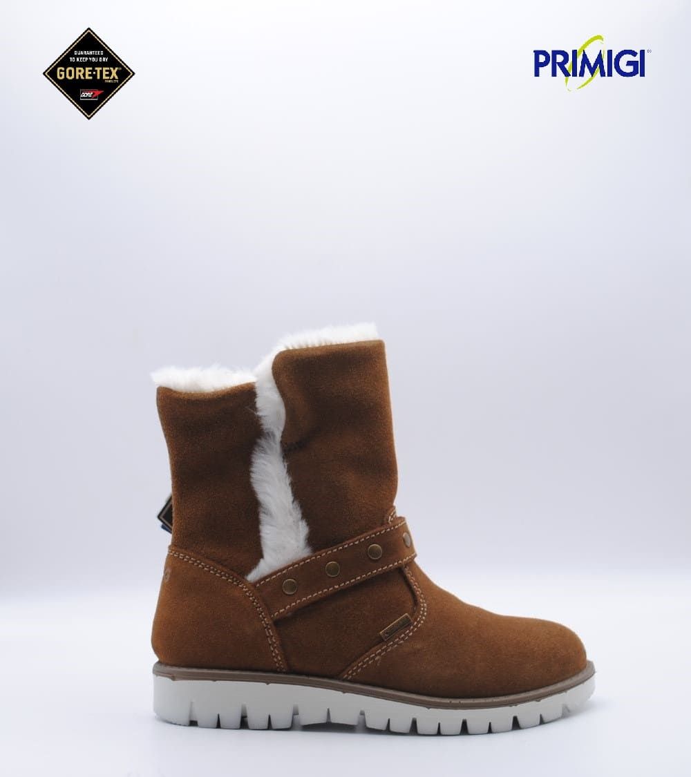 Bota de PRIMIGI fabricada en piel ante de color camel con GORETEX. Forrada interiormente con sintético efecto pelo de alta calidad. Unas botas todoterreno: para cole, días de lluvia, ir al parque, dar un paseo o más arreglados. Las mejores botas para todos los días de este invierno.