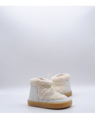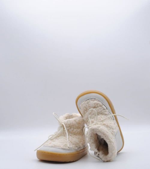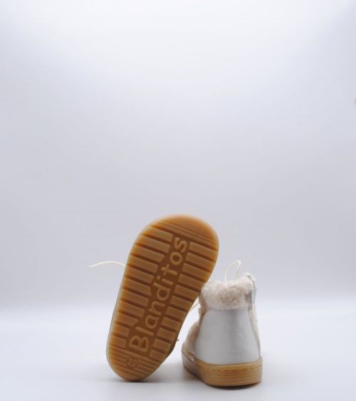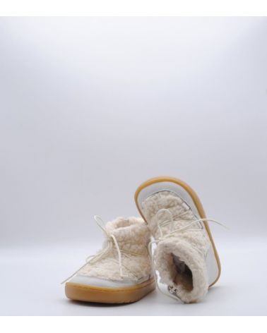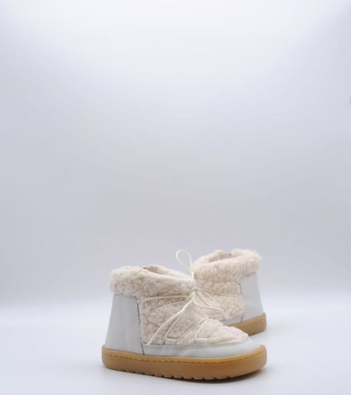 Botín respetuoso de Blanditos by Crio's modelo Nieve fabricado en piel color porcelana con trasera de pelo sintético, suela flexible por metatarsianos, 0 drop, cordones en empeine y sin contrafuerte. Un botín para usar todos los días de la temporada de frío.