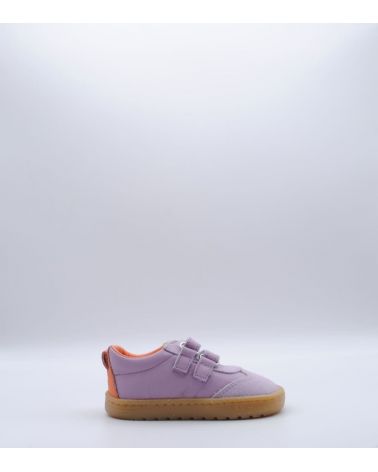 Deportivo respetuoso para niño y niña de Blanditos by Crio's modelo Lisboa fabricado en piel color lila con detalles en piel color naranja. Sistema de regulación con doble velcro. Plantilla extraíble y suela con 0 drop, flexible por metatarsianos. ¡No pueden ser más cómodos!