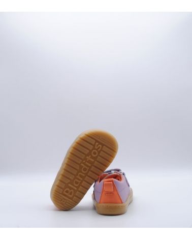 Zapatos deportivos de la marca Blanditos by Crio's modelo Lisboa fabricado en piel color lila con detalles de piel color naranja. Sistema de regulación con doble velcro y trasera acolchada. Aptos como zapatos de vestir o como zapatos de diario.