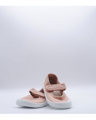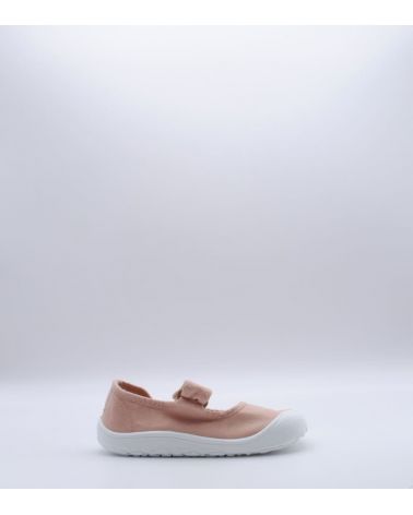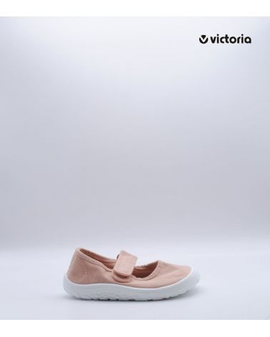 Lona estilo merceditas de la marca Victoria, parte de su colección Barefoot, fabricado en textil color rosa, con cierre de velcro, suela flexible por metatarsianos, 0 drop y horma ancha.
