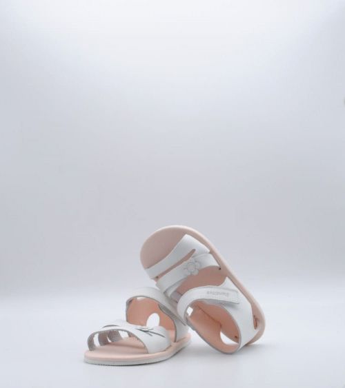 Sandalias respetuosas de la marca Blanditos by Crio's modelo Malta fabricados en piel blanca con flor en pala delantera. Sistema de regulación con velcro. ¡Unas sandalias que aportan comodidad para toda la temporada!