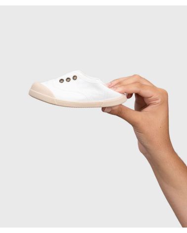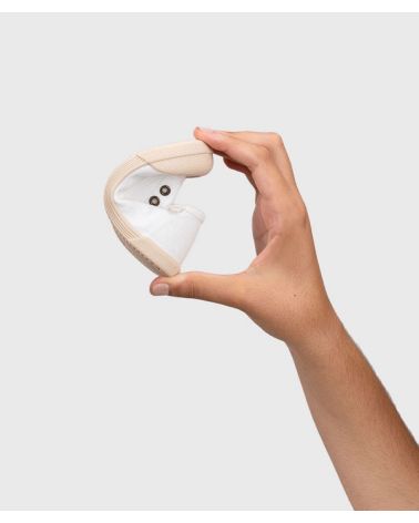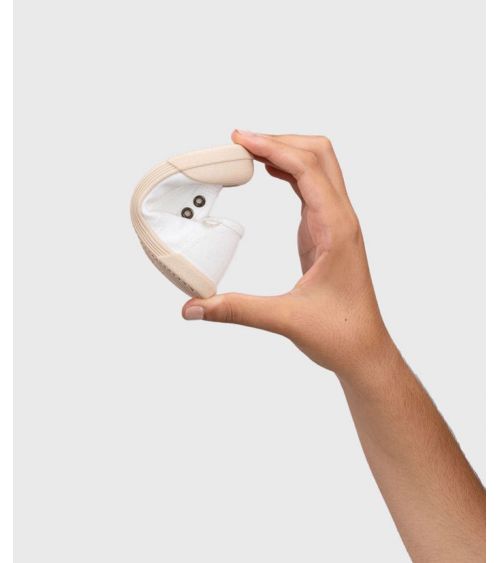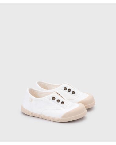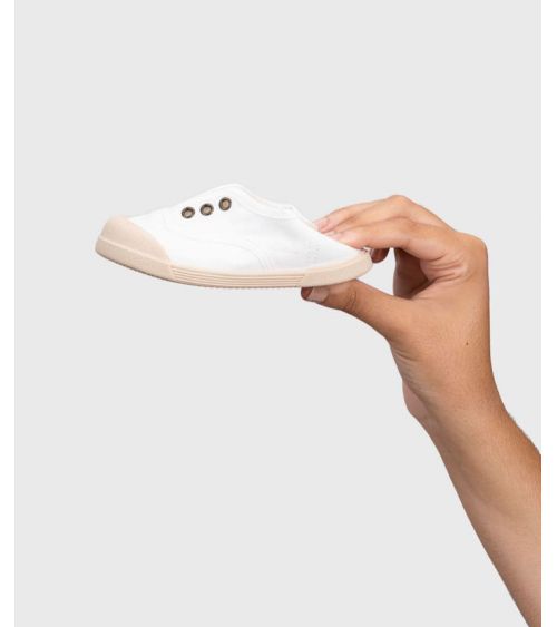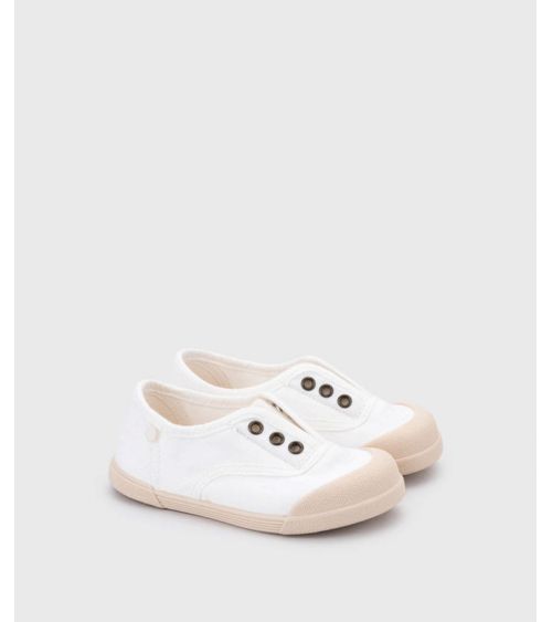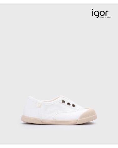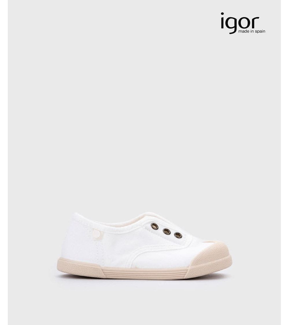 Lona respetuosa sin velcro (con elástico) de la marca Igor fabricada en material textil de color blanco con suela plana con 0 drop, flexible por metatarsianos y sin contrafuerte. Plantilla extraíble.